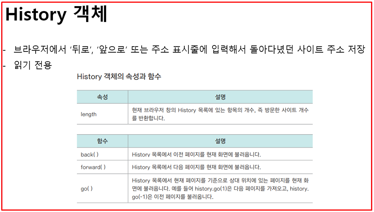 - 예: window.history.back()을 사용하여 이전 페이지로 이동할 수 있습니다.