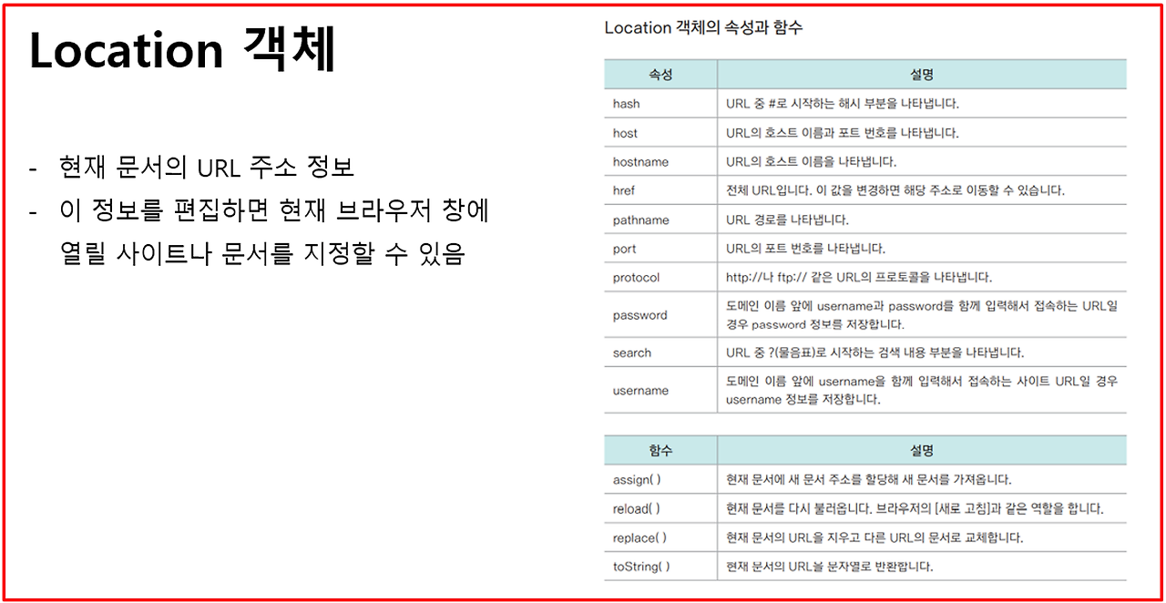 - 현재 창의 URL을 관리하며, 리다이렉트, 리로드 등을 수행할 수 있습니다.