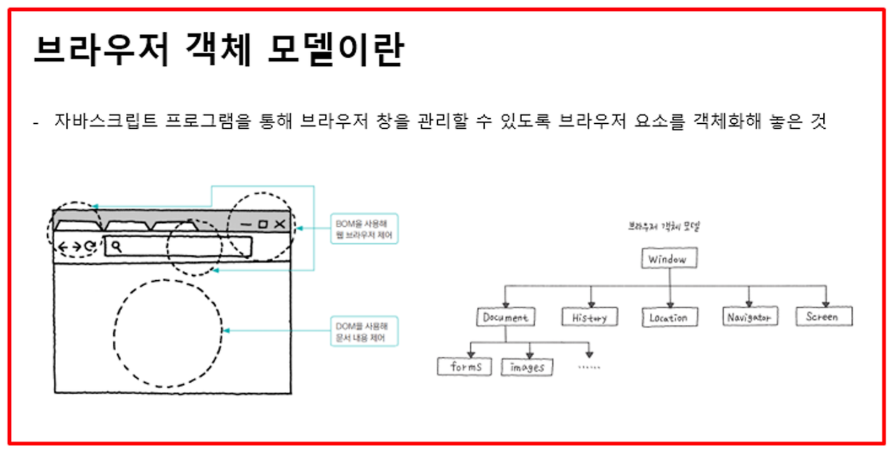 프로그램을 통해 브라우저 창을 관리할 수 있도록 브라우저 요소를 객체화 시켜 놓은 것을 의미합니다. 추가 적으로 BOM은 하나의 객체만을 가리키는 것이 아니라 브라우저와 관련된 여러 객체들을 포함하며 그 구조는 최상위 객체는 window 객체와 그 하위 객체들로 이루어져 있습니다.