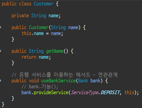 자동차 클래스가 엔진 클래스에 의존할 때 자동차 클래스는 엔진을 사용하고 있으며 엔진 클래스의 변경이 자동차 클래스에 영향을 줄 수 있다.