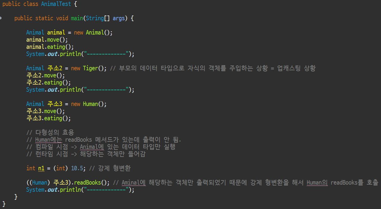 - 업캐스팅된 객체가 실제로 클래스의 객체일 때만 가능함. 그렇지 않으면 ClassCastException(예외) 발생 가능