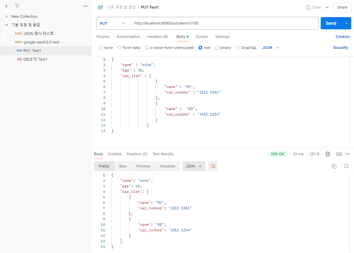 - PUT 요청은 멱등성을 가집니다. 즉, 동일한 요청을 여러 번 보내도 결과가 동일합니다. 예를 들어, 동일한 데이터를 PUT 요청으로 여러 번 보내도 리소스 상태는 변하지 않습니다.