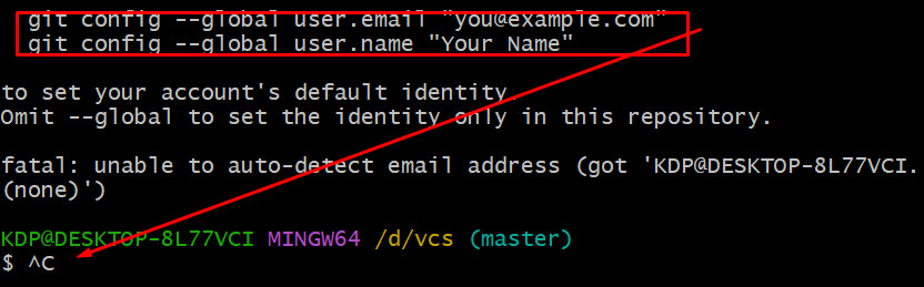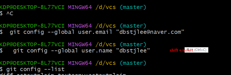 깃허브의 이메일과 닉네임을 기입하여 shift + insert 단축키로 붙여넣기를 한다.