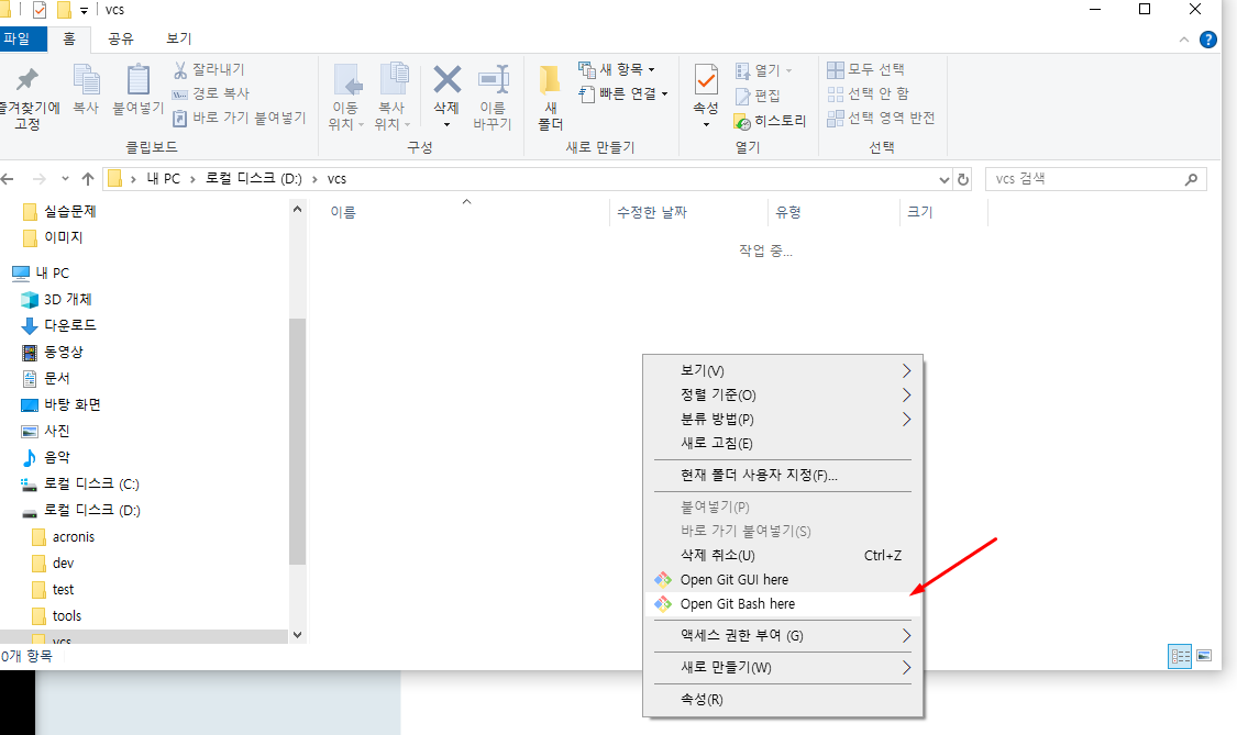 D 드라이브에서 vcs 파일 생성 > shift + 우측 마우스 클릭 > Open Git Bash here (cmd 같은게 열림.)