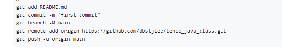 10. 깃허브에서 새로운 Repository를 생성해서 나온 아래의 코드 세 줄(git branch, remote, push~~)을 복사해서 붙여 넣으면 허브의 Repository에 자동으로 이클립스에서 생성한 패키지들이 업로드된다.