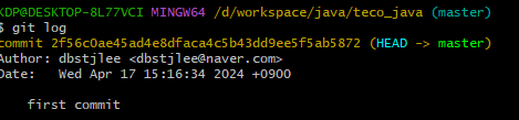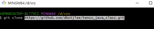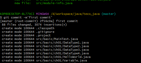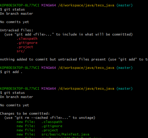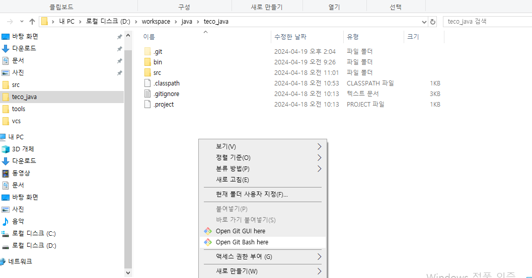 1. 이클립스의 java 코드가 있는 폴더( 내 파일의 경우: D:\workspace\java\teco_java )에서 Git을 실행한다.