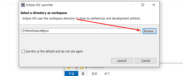 이클립스 런처 위치 선택 > Browse > D:\workspace\java 파일 생성 후 선택