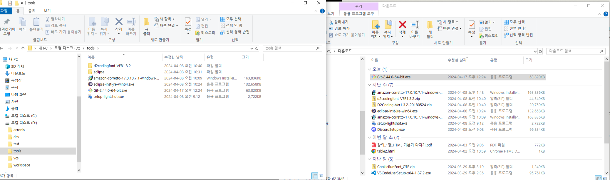 다운로드 받은 도구들 => D:\tools\이클립스(파일 생성 후), JDK 다운 파일 옮기기