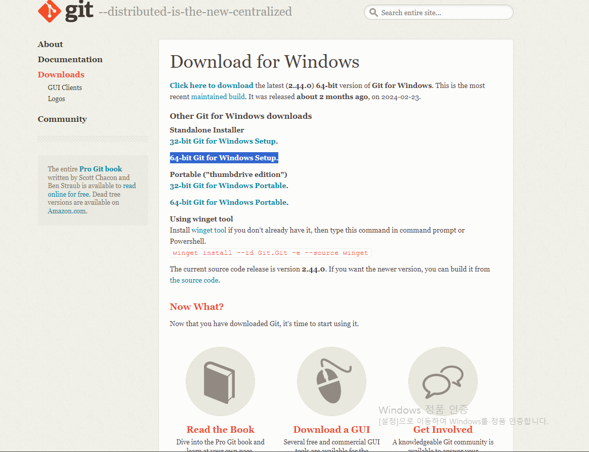 git 사이트에서 다운로드 클릭 > 64-bit git for windows setup 클릭해서 다운로드 받기