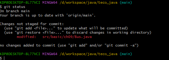 2. git status 입력 시 modified...파일명.java 하고 빨간색 글씨로 수정된 파일명이 뜬다.