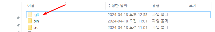 화면에 git init을 입력하면 .git이라는 숨김항목 폴더(숨김 항목 체크 해제 시 안 보임)가 자동으로 생성된다.