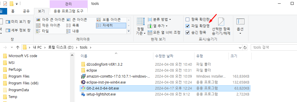 다운로드 받은 git을 D 드라이브의 tools 파일에 담기