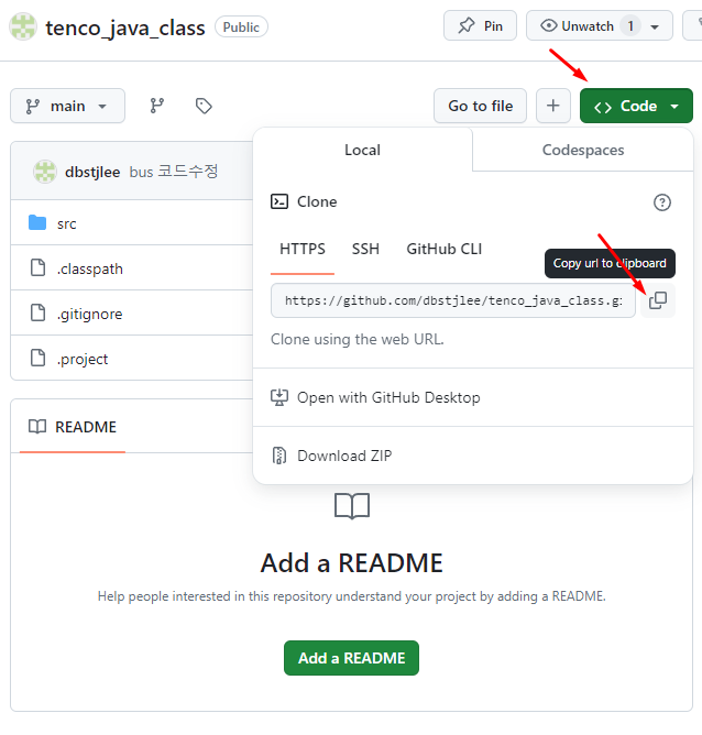 2. < > code 버튼을 누른 후 http 링크를 복사한다.
