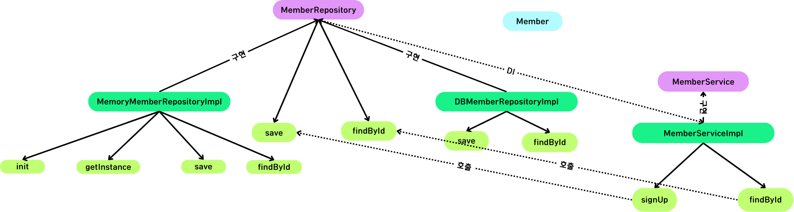 MemberServiceImpl 클래스는 MemberRepository 인터페이스로부터 의존성 주입을 받음