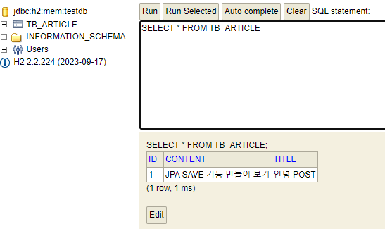 h2-console에서 insert 된 data 값을 확인할 수 있습니다.