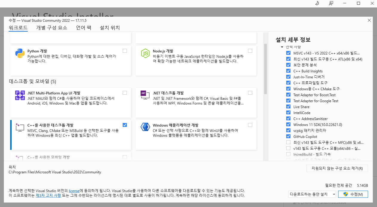 여기서 C++를 사용한 데스트톱 개발 및 그 외에 필요한 부분을 선택한 후