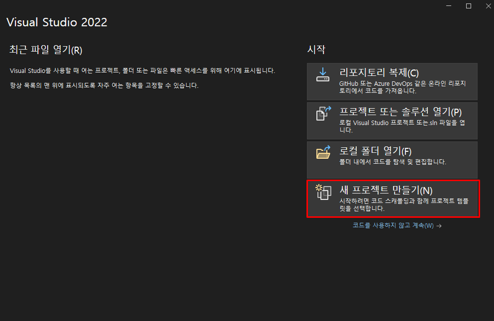 실행되면 새 프로젝트 만들기를 선택한다.