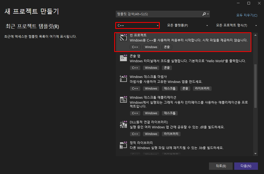 빈 프로젝트를 선택한 후 다음을 누른다.