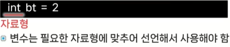 - int 형 변수를 생성했으므로 bt 안에는 정수만 담을 수 있음