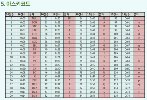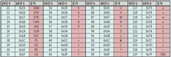 - 각 문자를 0, 1로 표현하기 위해 ASCII 코드가 지정되어 있음