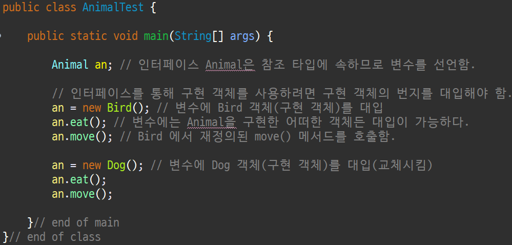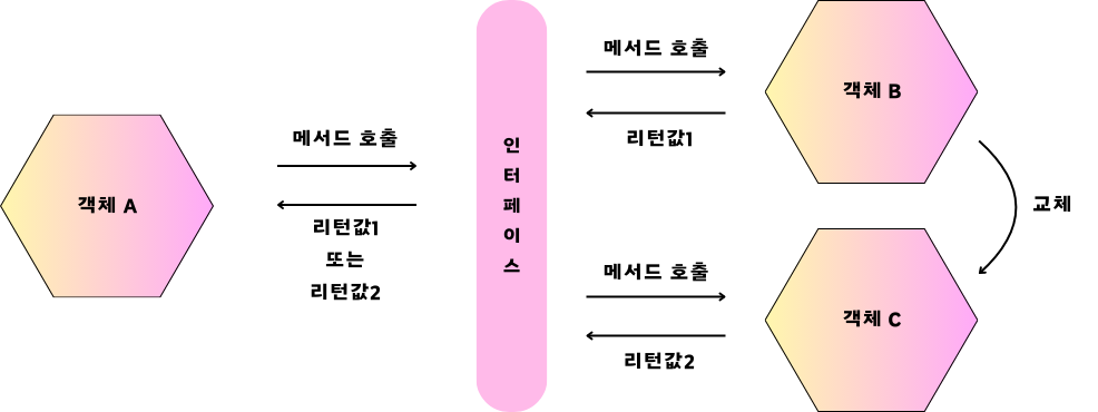 객체 A 가 인터페이스의 메서드를 호출하면 실제로 실행되는 것은 인터페이스 뒤편의 객체 B 또는 객체 C 의 메서드다.