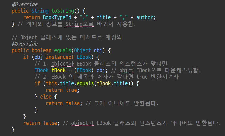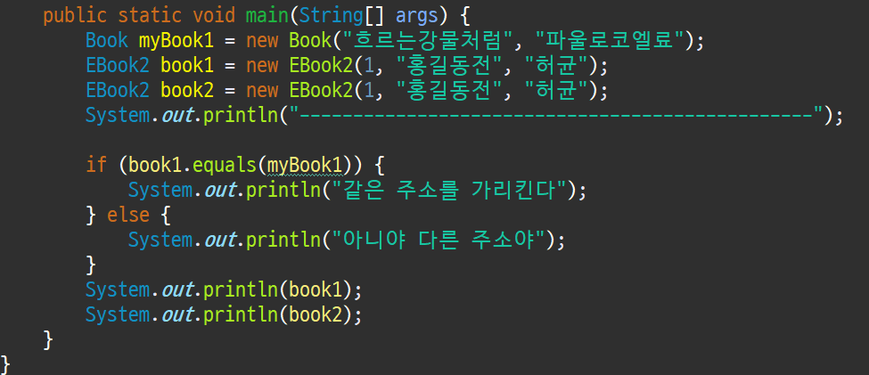코드 테스트 2 실행 시 if 문의 조건식인 book1과 myBook1의 문자열 값이 다르므로 else 구문이 실행되어