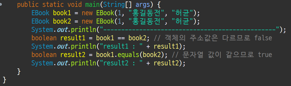 기본적인 동작은 두 인스턴스의 주소값을 비교하여 true/false를 반환한다.