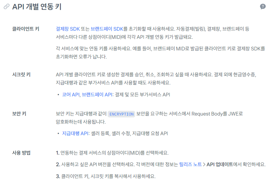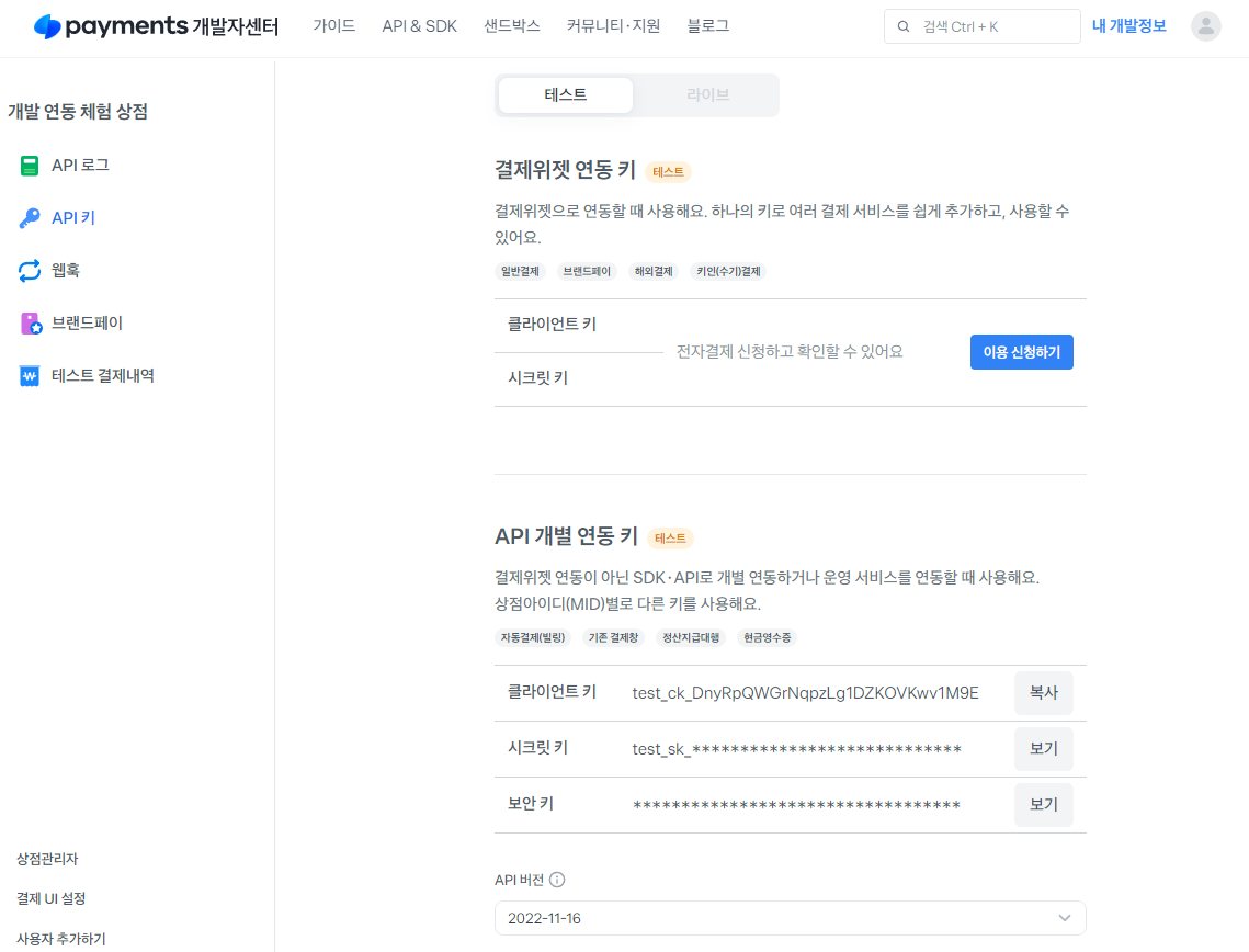 클라이언트 키는 브라우저에서 토스페이먼츠 SDK를 초기화할 때 사용한다.