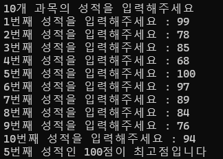 10개 과목 성적을 배열로 입력받아 최고 성적을 구하세요