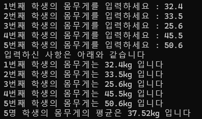 cout << "5명 학생의 몸무게의 평균은 " << avg << "kg 입니다";