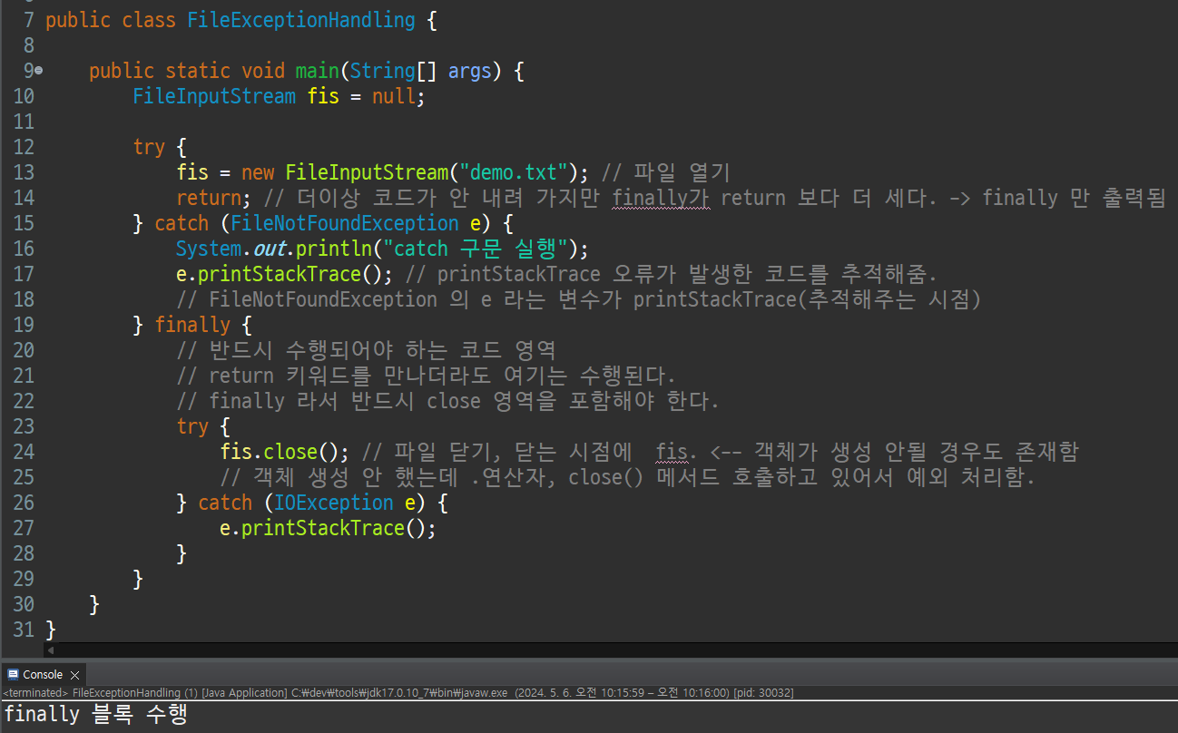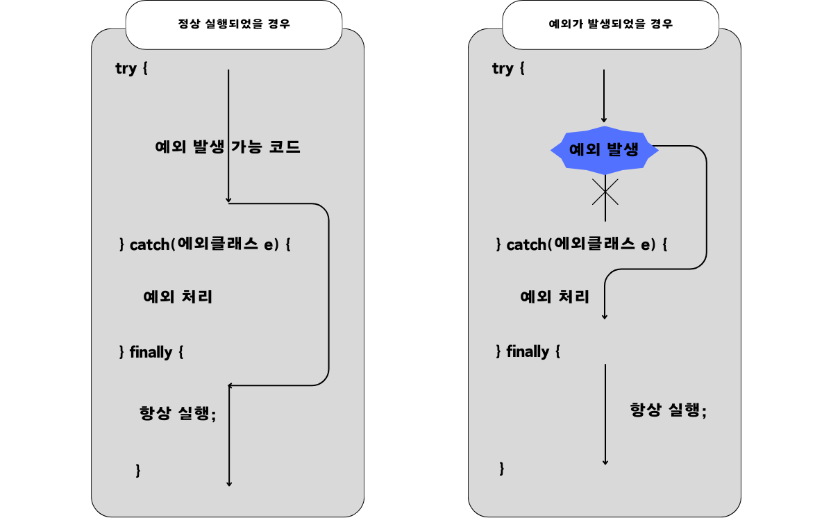 finally 블록: try 블록의 실행 여부와 관계 없이 항상 실행되어야 하는 코드(예: 자원 해제 로직)를 포함한다. finally 블록은 모든 catch 블록 다음에 자원을 닫아주어야 할때 온다. try 블록과 catch 블록에서 return 문(메서드 종료)을 사용하더라도 finally 블록은 항상 실행된다.