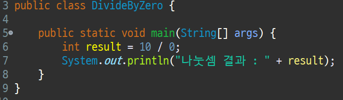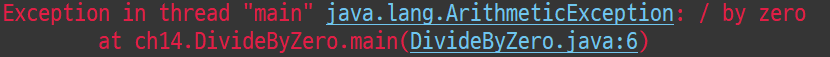 정수 10을 0으로 나누었기 때문에 ArithmeticException 예외가 발생하였다. 현재 예외처리를 하고 있지 않기 때문에 예외가 발생하는 즉시 프로그램이 종료되었다. 예외가 발생한 지점 이후의 문장들은 실행되지 않는다.