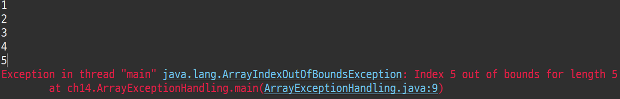 ch14 패키지의 ArrayExceptionHandling 클래스의 main 스레드의 9 라인(System.out.println(arr[i])에서 예외 발생함.