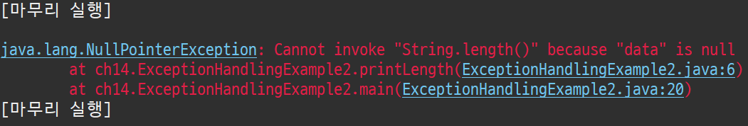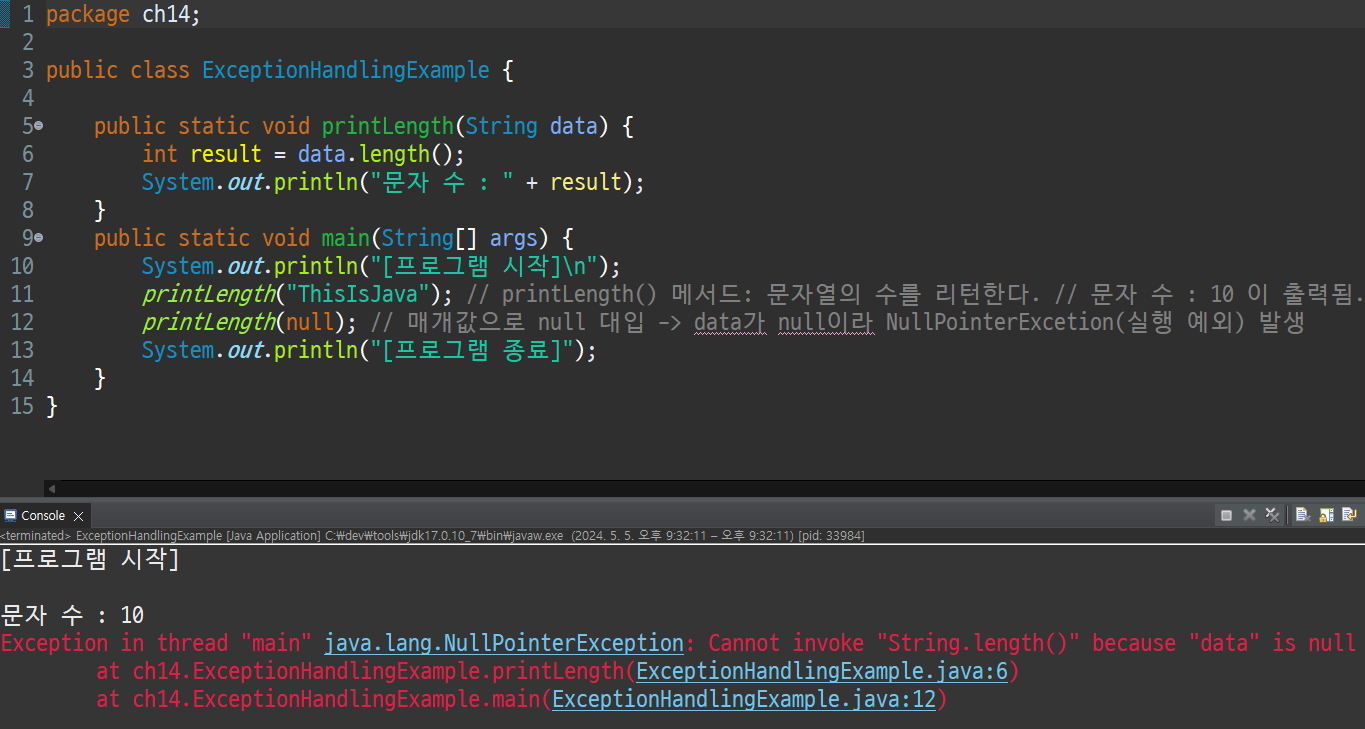 ch14 패키지의 ExceptionHandlingExample 클래스의 printLength() 메서드 내의 6라인에서