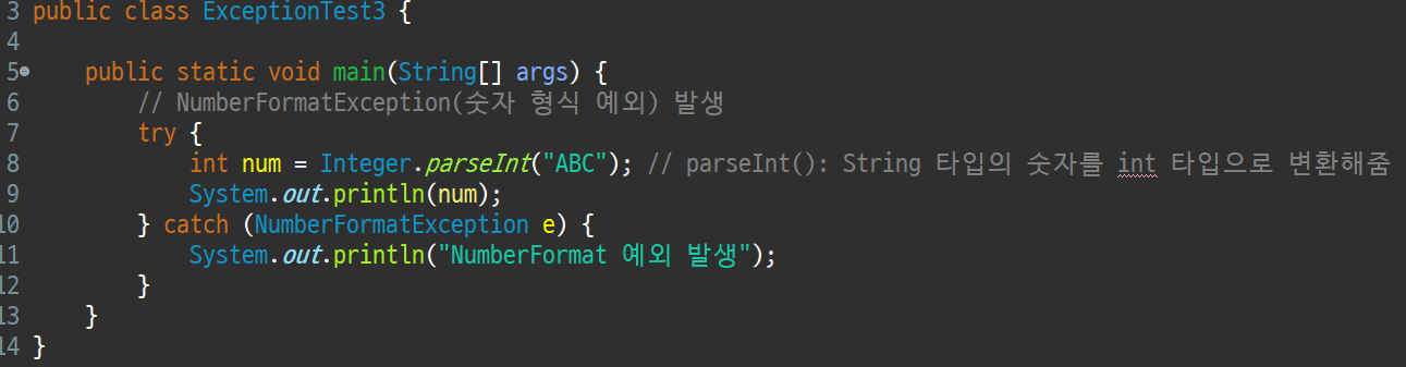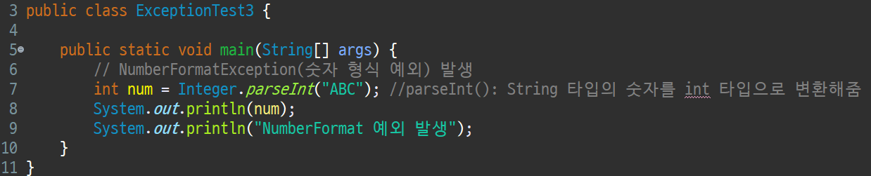 6 라인에서 Integer.parseInt() 메서드를 통해 문자가 숫자로 변환이 되어서 예외가 발생하였다.