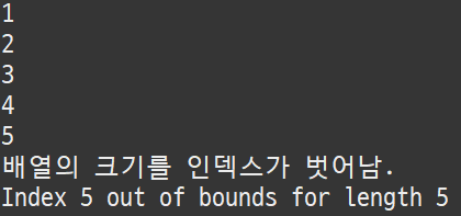 메인 스레드에서 ArrayIndexOutOfBoundsException 예외 발생: 배열 크기 5인데 인덱스 길이가 5를 벗어남.(인덱스 길이는 4여야 함.)