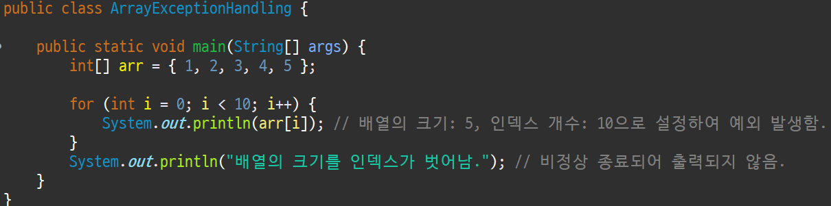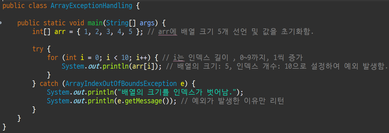 | ArrayIndexOutOfBoundsException | 배열을 참조하는 인덱스가 잘못된 경우 |