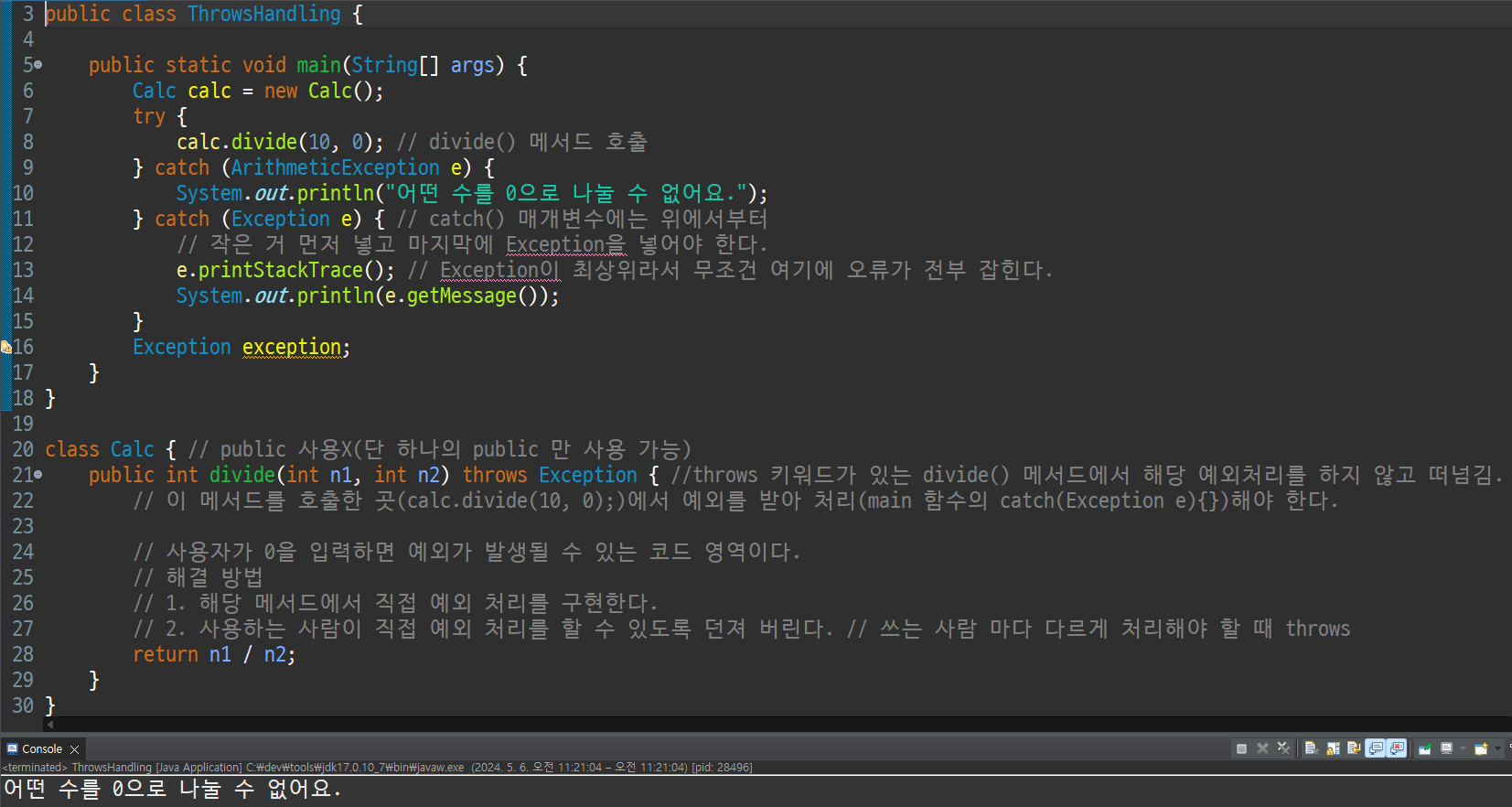 즉, throws Exception은 Exception 예외가 발생하면 상위 메서드(divide())로 예외를 던져서 처리하겠다는 의미이다.