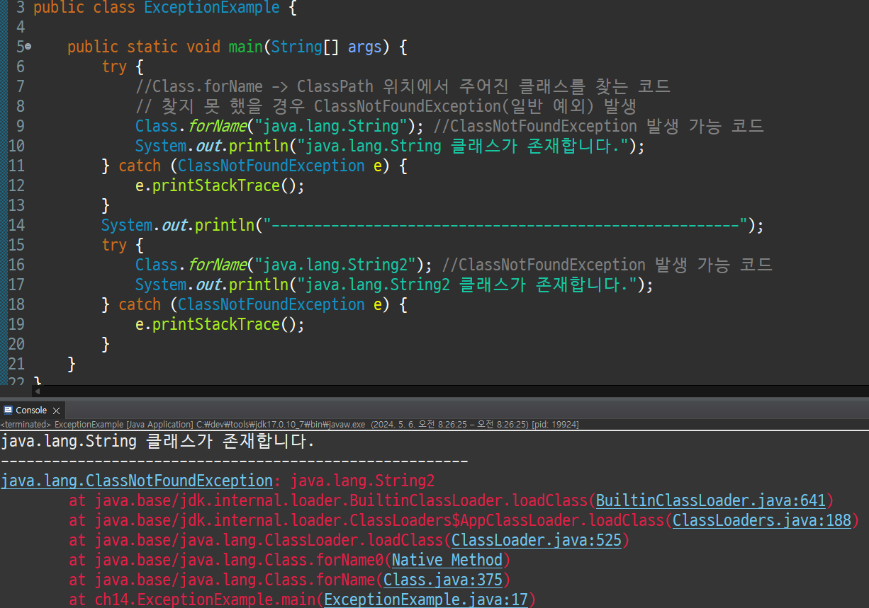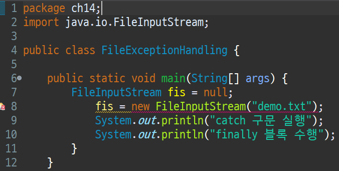 ch14 패키지의 ExceptionHandlingExample 클래스의 main 함수 내의 12라인에서
