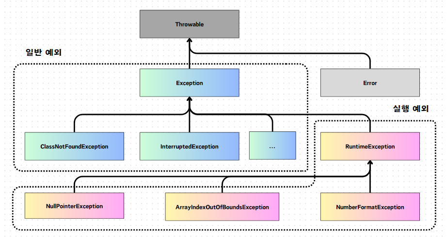 자바의 모든 에러와 예외 클래스는 Throwable을 상속받아 만들어지고, 추가적으로 예외 클래스는 java.lang.Exception 클래스를 상속 받는다.