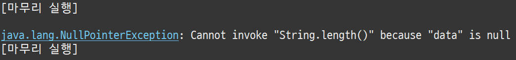 main 스레드에서 예외 발생(java.lang.NullPointerException): data 가 null이라서 String.length() 를 호출할 수 없다