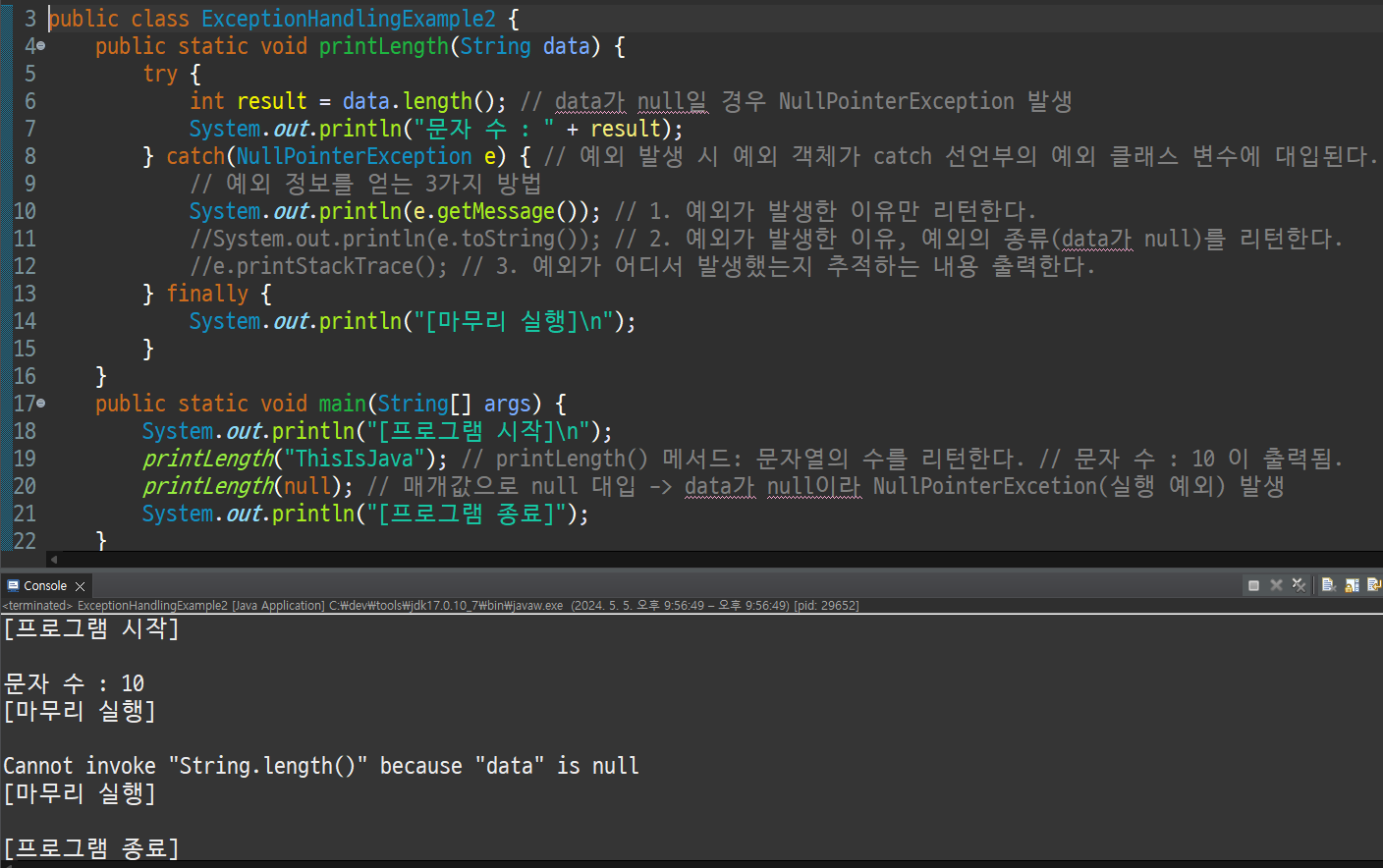 여기에 예외 처리 코드를 추가하자면, try 블록에서 NullPointerException이 발생하면 catch 블록을 실행해서 예외를 처리하도록 하고 예외 발생 여부와 상관 없이 finally 블록(자원(리소스)을 닫아주어야 할 때)을 실행하여 마무리하면 된다.