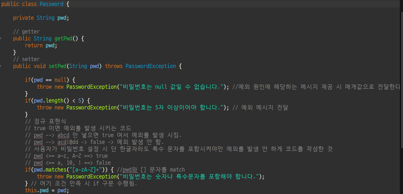 | 사용자 정의 예외 클래스 만드는 방법 1. 클래스를 설계 해서 상속 받아야 한다. 2. 활용할 수 있는 클래스에서 throws 와 throw 를 활용(Password 클래스에서 활용) 3. 코드 실행 시점에서 테스트 및 예외 처리 작성 |
