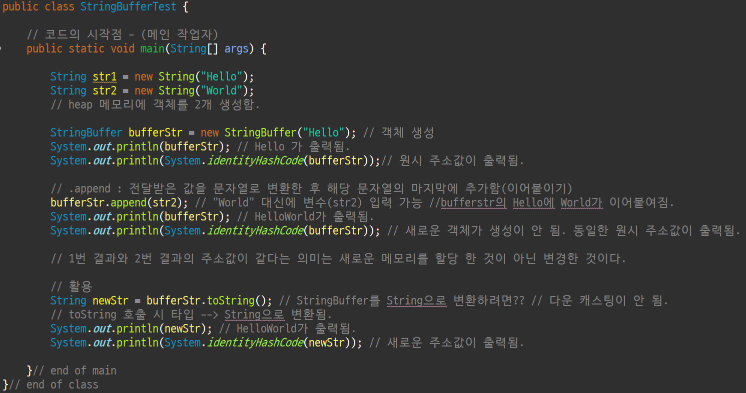 - StringBuffer는 멀티 쓰레드 프로그래밍에서 동기화(synchronization)을 보장