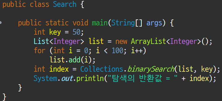 Collections 클래스의 binarySearch 알고리즘은 정렬된 리스트에서 지정된 원소를 이진 탐색한다. binarySearch()는 리스트와 탐색할 원소를 받는다. (리스트는 정렬되어 있다고 가정함)