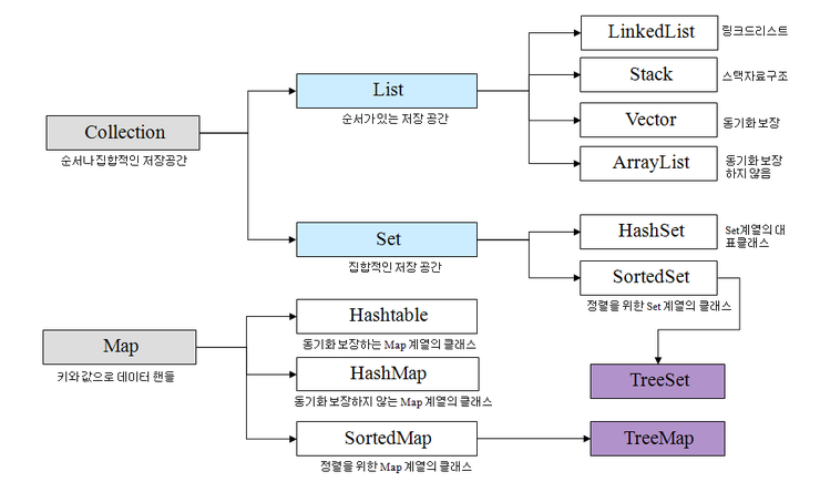 | Map | 키와 값들이 연관되어 있는 사전과 같은 자료구조 |