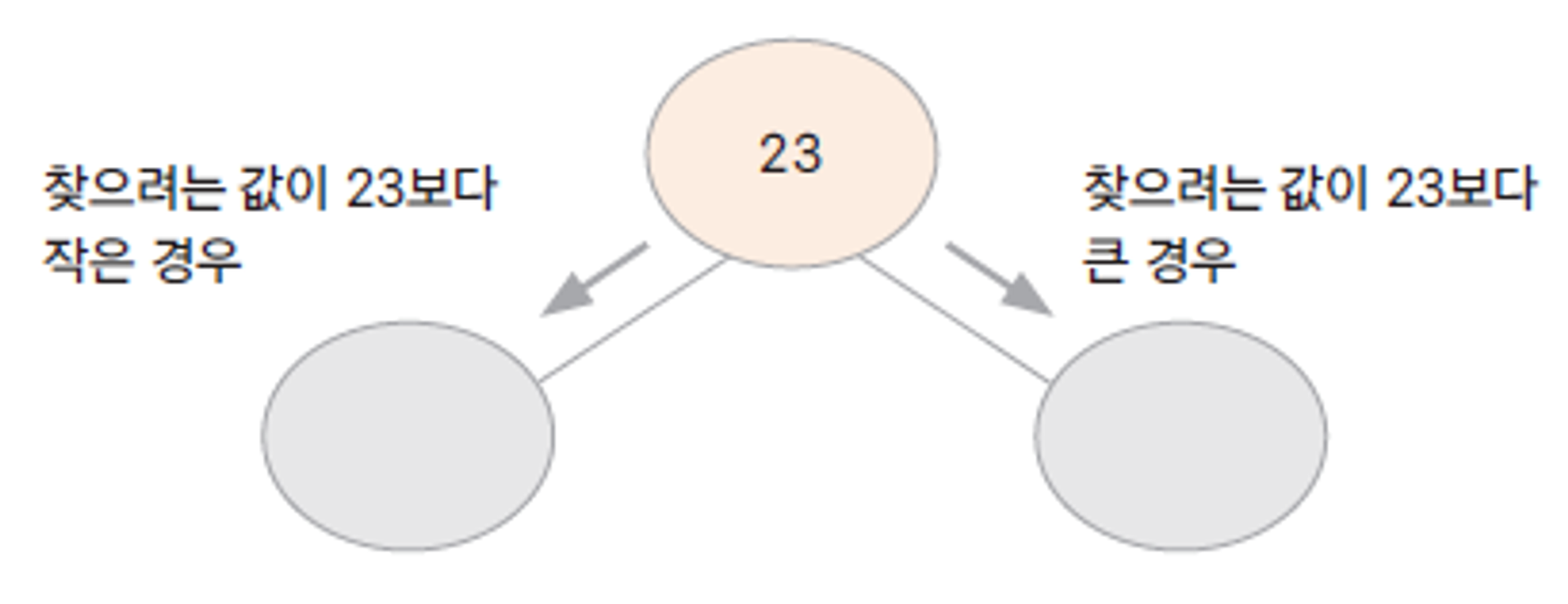 - 중간 원소보다 찾고자 하는 원소가 크면 뒷부분에 있고, 작으면 앞부분에 있다.