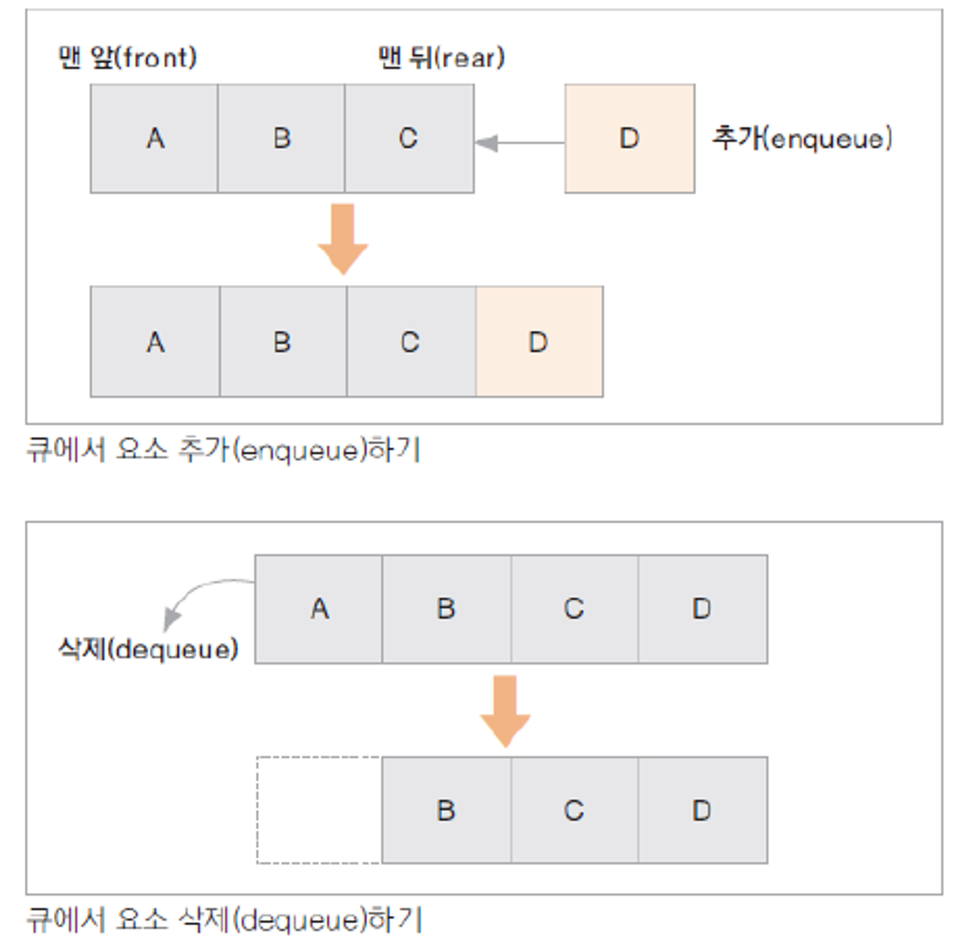 | Queue | 극장에서의 대기줄과 같이 들어온 순서대로 나가는 자료구조 |