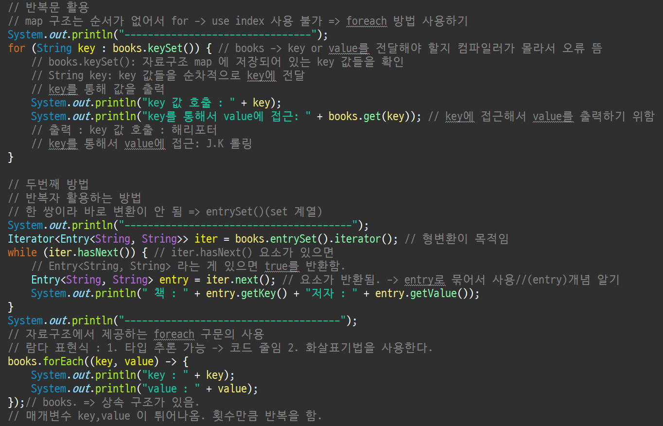 Map은 Collection 인터페이스를 방문하지 않습니다. 그러므로 Map에 저장된 데이터를 꺼내는 코드는 다른 컬렉션과는 약간 다릅니다.