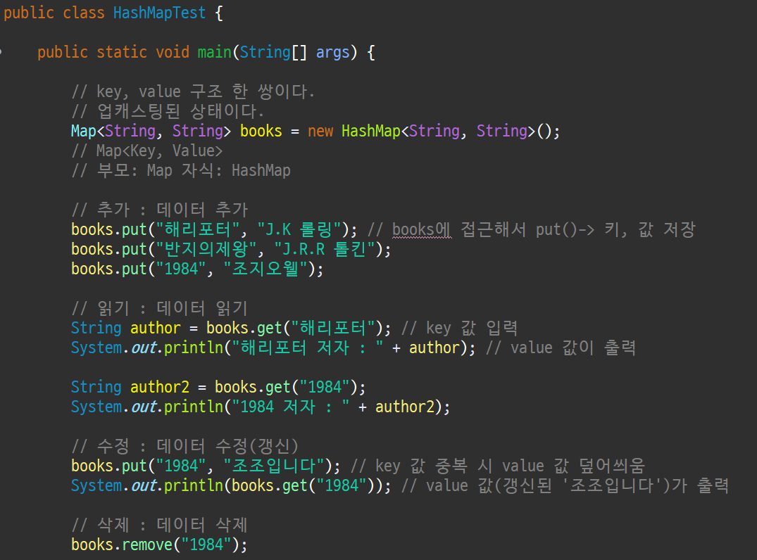 - 설명: 지정된 키와 값을 매핑하여 Map에 저장합니다.